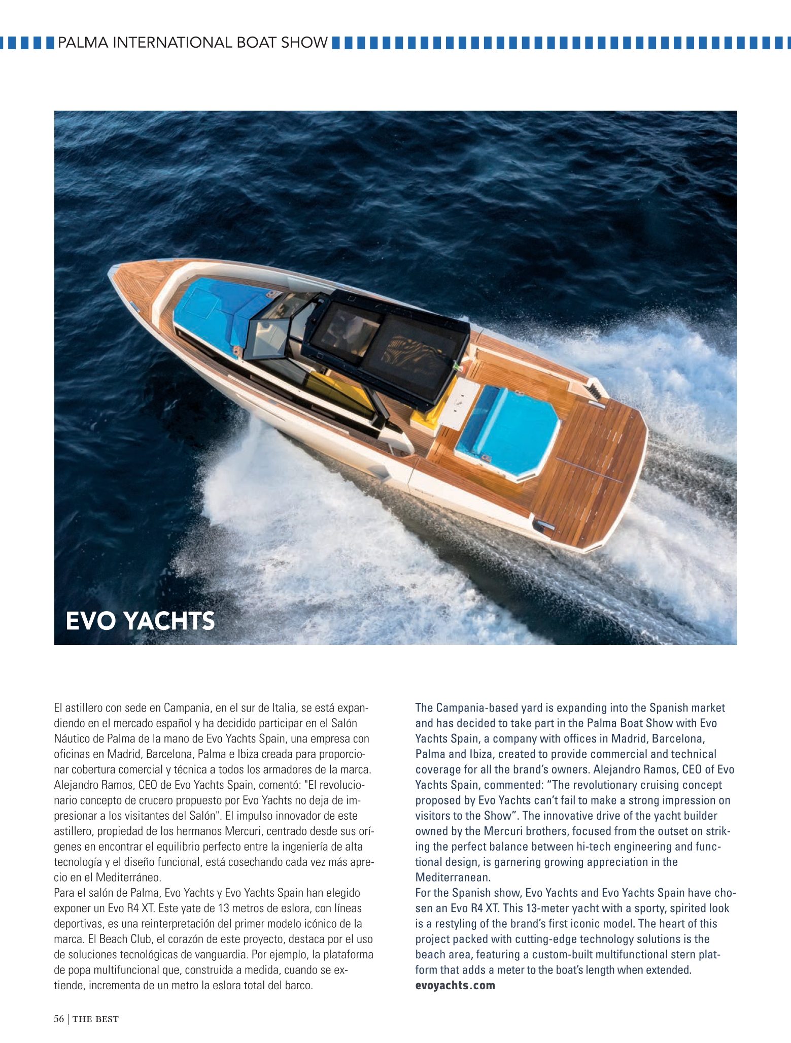 Il cantiere campano, nel sud Italia, si espande nel mercato spagnolo e ha deciso di partecipare al Palma Boat Show con Evo Yachts Spain, azienda con sedi a Madrid, Barcellona, Palma e Ibiza nata per fornire copertura commerciale e tecnica a tutti i proprietari di marchi. Alejandro Ramos, CEO di Evo Yachts Spain, ha commentato: “Il rivoluzionario concetto di crociera proposto da Evo Yachts continua a stupire i visitatori del salone.” La spinta innovativa di questo cantiere, di proprietà dei fratelli Mercuri, focalizzato fin dalle origini sulla ricerca del perfetto equilibrio tra ingegneria ad alta tecnologia e design funzionale, sta guadagnando sempre più apprezzamento nel Mediterraneo. Per lo spettacolo di Palma, Evo Yachts ed Evo Yachts Spain hanno scelto di esporre un Evo R4 XT. Questo yacht lungo 13 metri, dalle linee sportive, è una reinterpretazione del primo modello iconico del marchio. Il Beach Club, cuore di questo progetto, si distingue per l’utilizzo di soluzioni tecnologiche all’avanguardia. Ad esempio la piattaforma di poppa multifunzionale che, realizzata su misura, una volta estesa aumenta di un metro la lunghezza fuori tutto dell’imbarcazione.