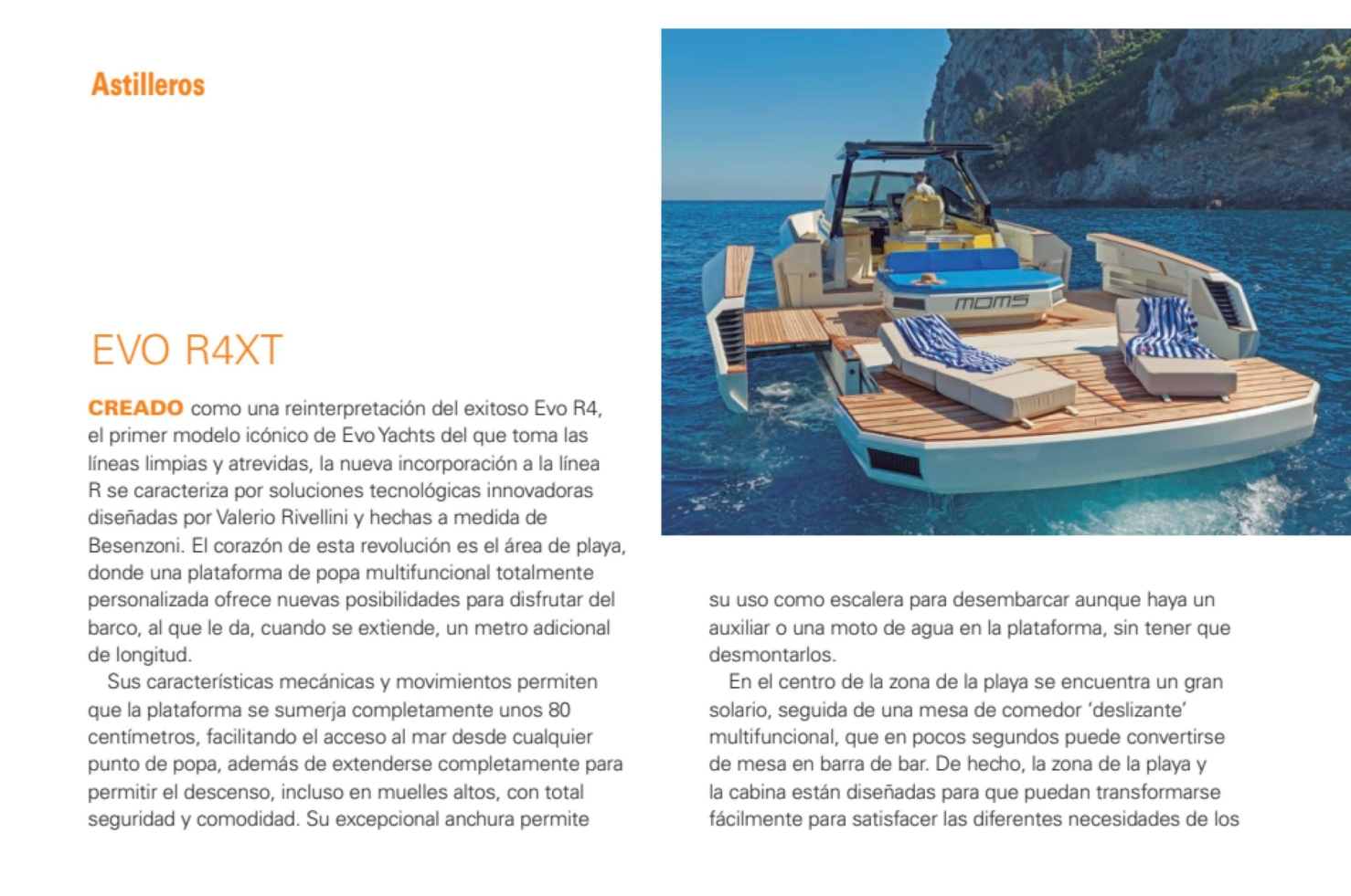 CREATED as a reinterpretation of the successful Eva R4, the first iconic EvoYachts model from which it takes its clean and bold lines, the new addition to the R line is characterized by innovative technological solutions designed by Valerio Rivellini and tailor-made by Besenzoni.