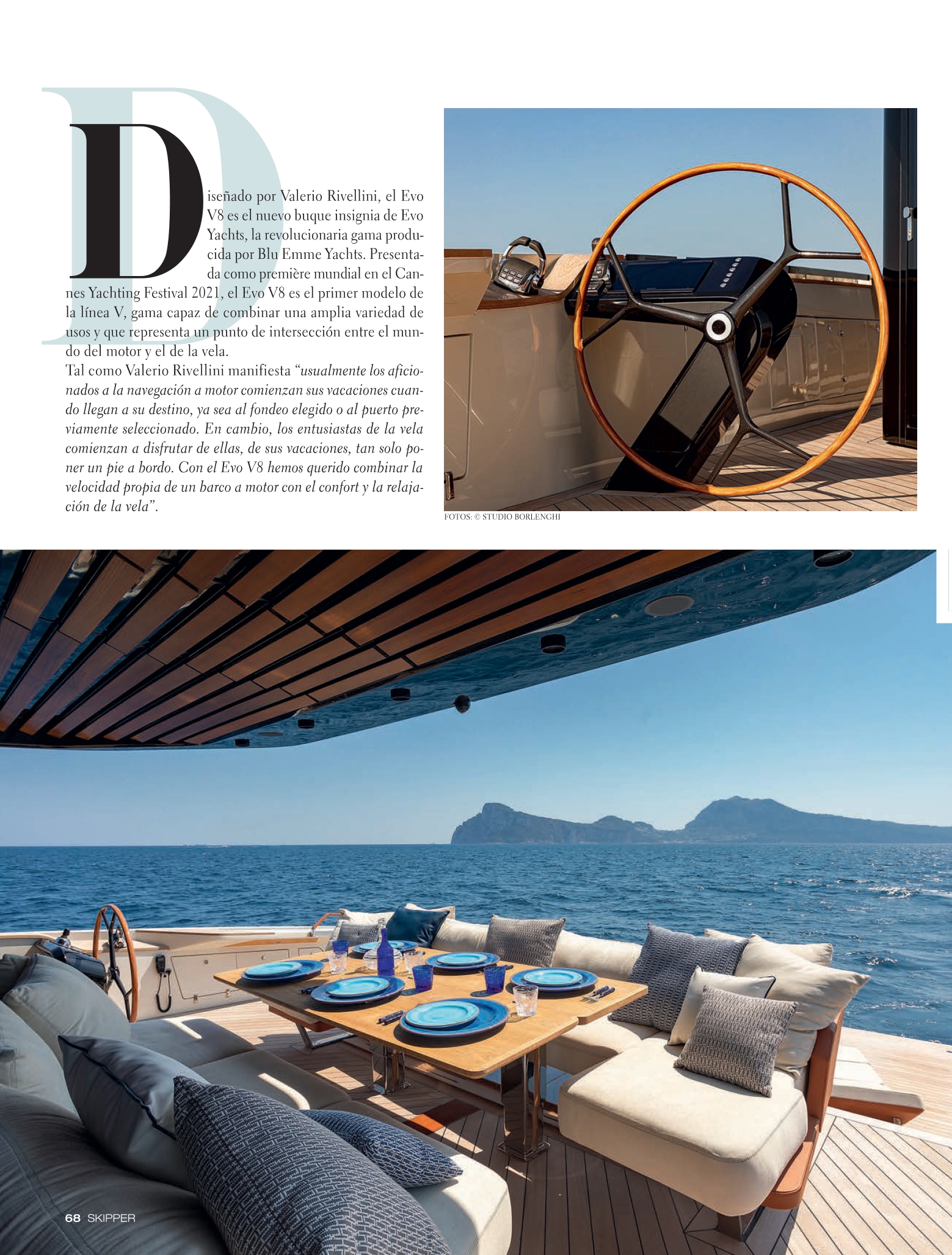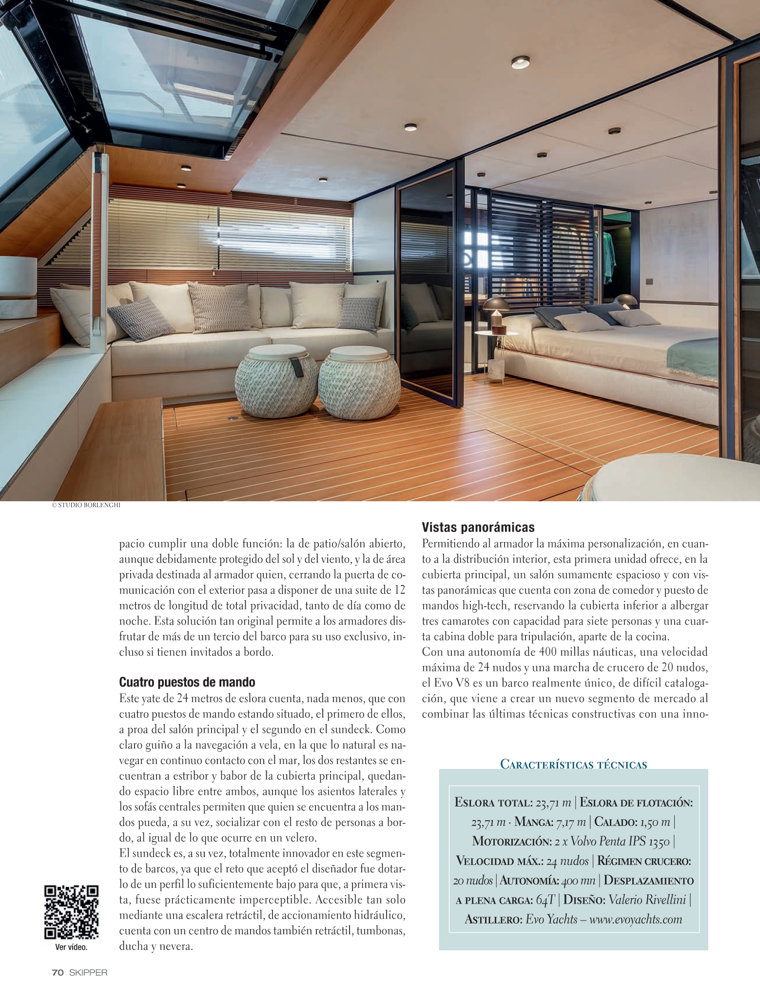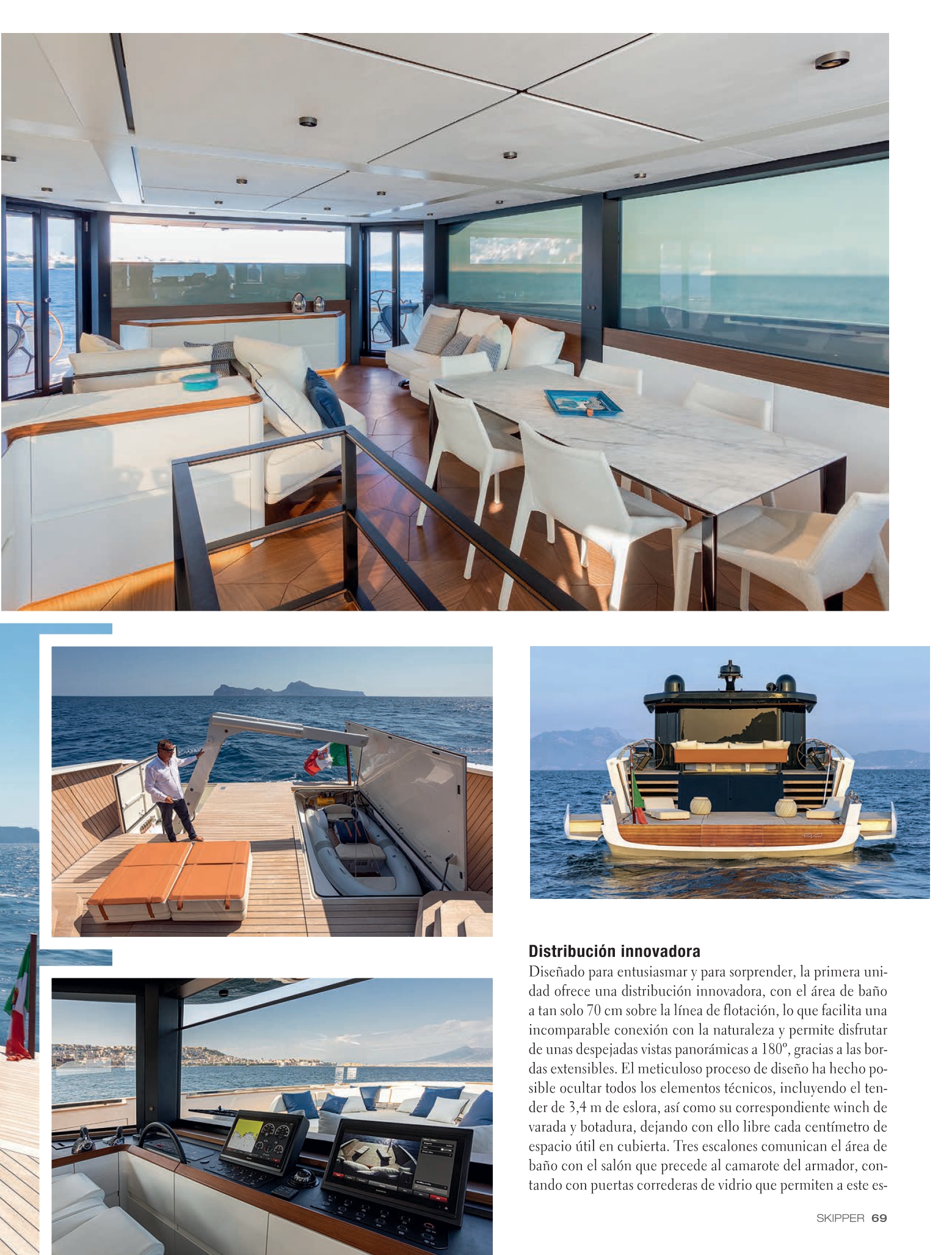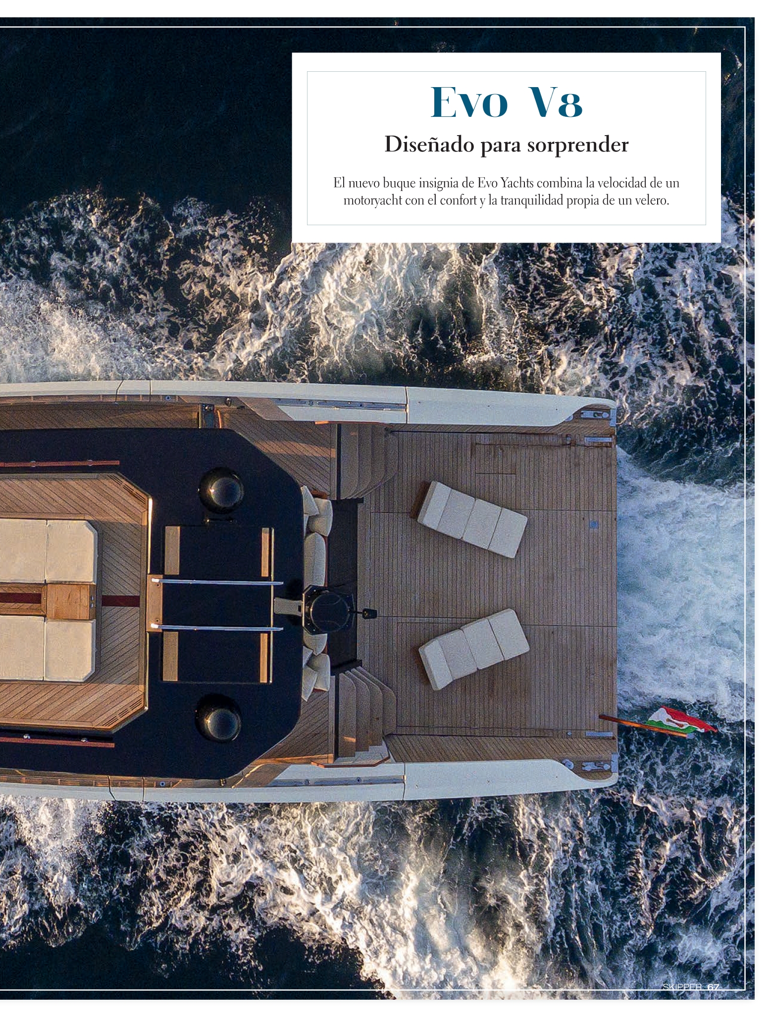 Con Evo V8 abbiamo voluto coniugare la velocità di una barca a motore con il comfort e il relax della navigazione”. Layout innovativo Pensato per emozionare e sorprendere, il primo esemplare propone un layout innovativo, con la zona bagno a soli 70 cm sopra la linea di galleggiamento , che facilita un impareggiabile collegamento con la natura e consente di godere di viste panoramiche a 180º senza ostacoli, grazie alle guide estensibili.