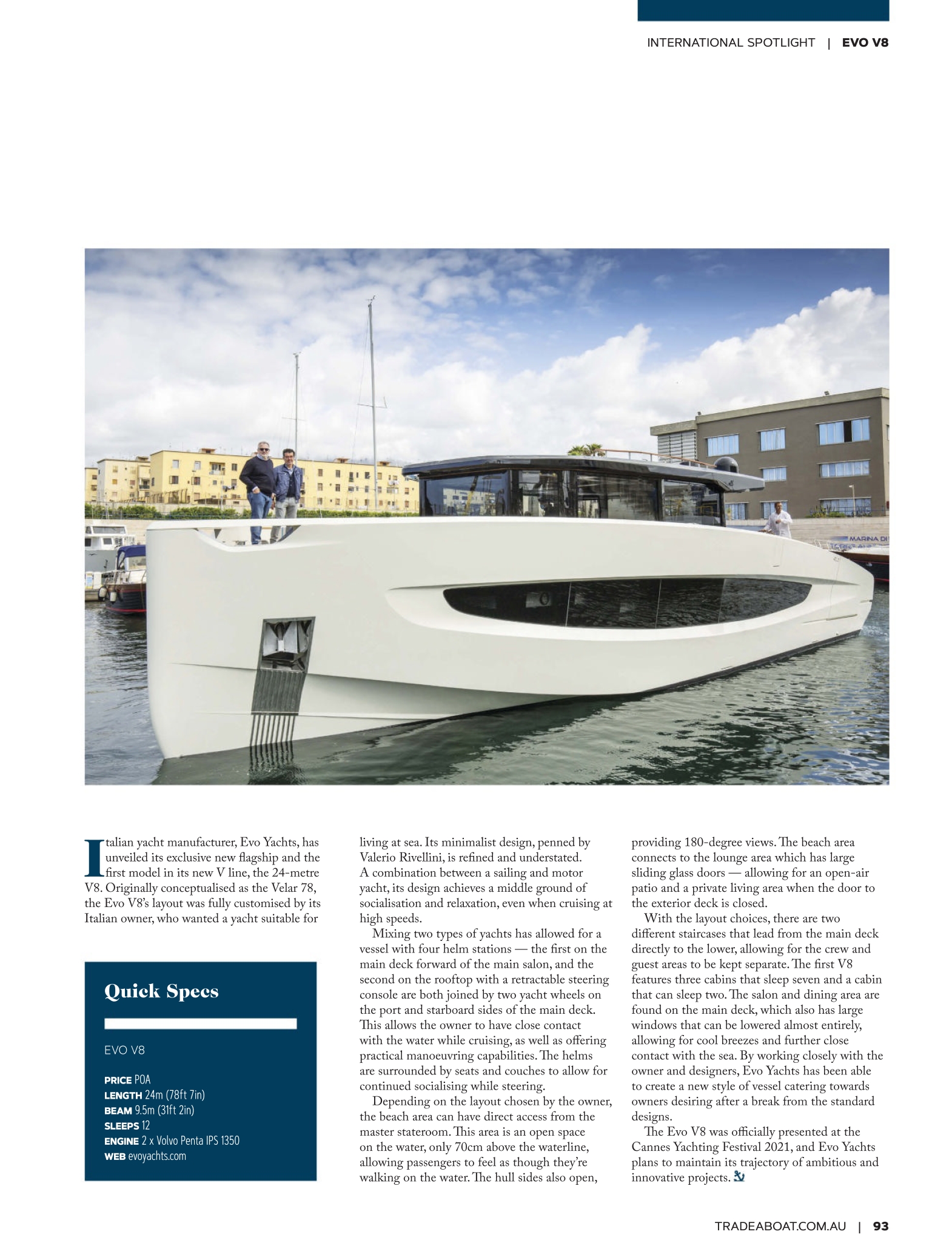 L’omaggio del costruttore di barche a motore allo yacht a vela è un kit intelligente. Chris Carter racconta che Valerio Rivellini, il giovane designer napoletano del nuovo Evo Yachts V8, è un uomo a cui piace navigare, afferma Alan Harper sulla rivista Power & Motoryacht.