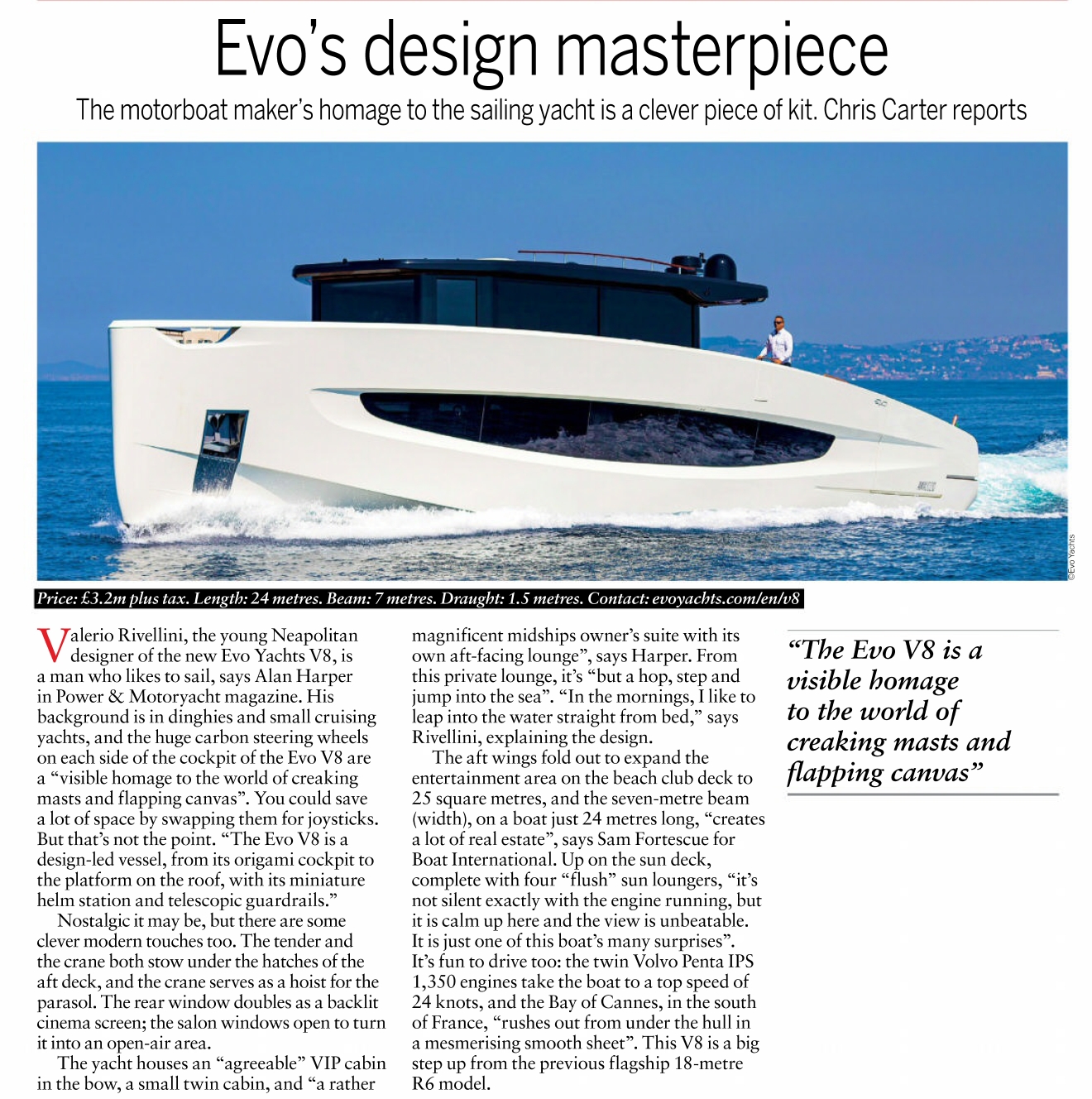 L’omaggio del costruttore di barche a motore allo yacht a vela è un kit intelligente. Chris Carter racconta che Valerio Rivellini, il giovane designer napoletano del nuovo Evo Yachts V8, è un uomo a cui piace navigare, afferma Alan Harper sulla rivista Power & Motoryacht.