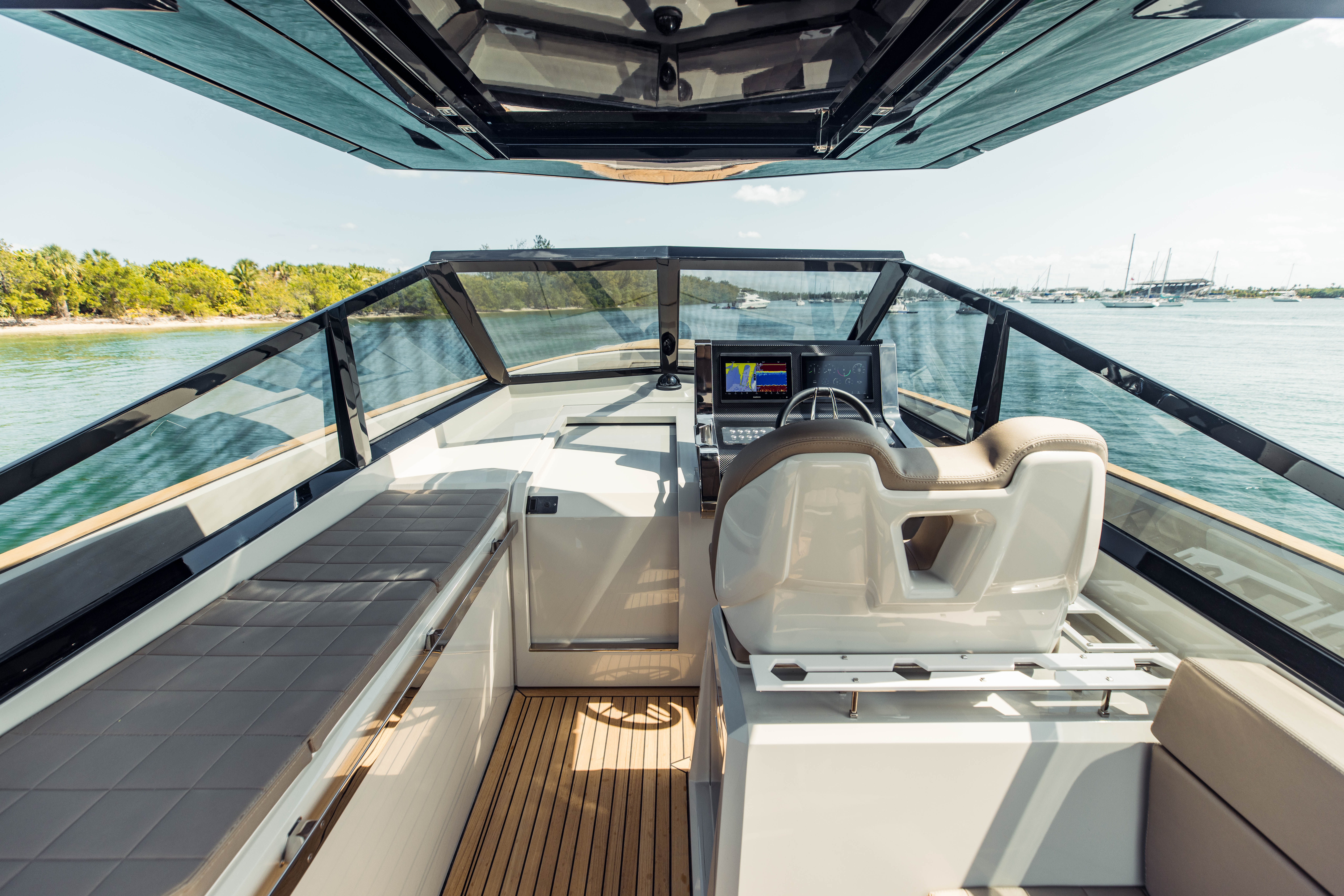 EVO’s first day-cruiser is sleek as usual with a larger walkable area around the helm station and the signature extensible sundeck.