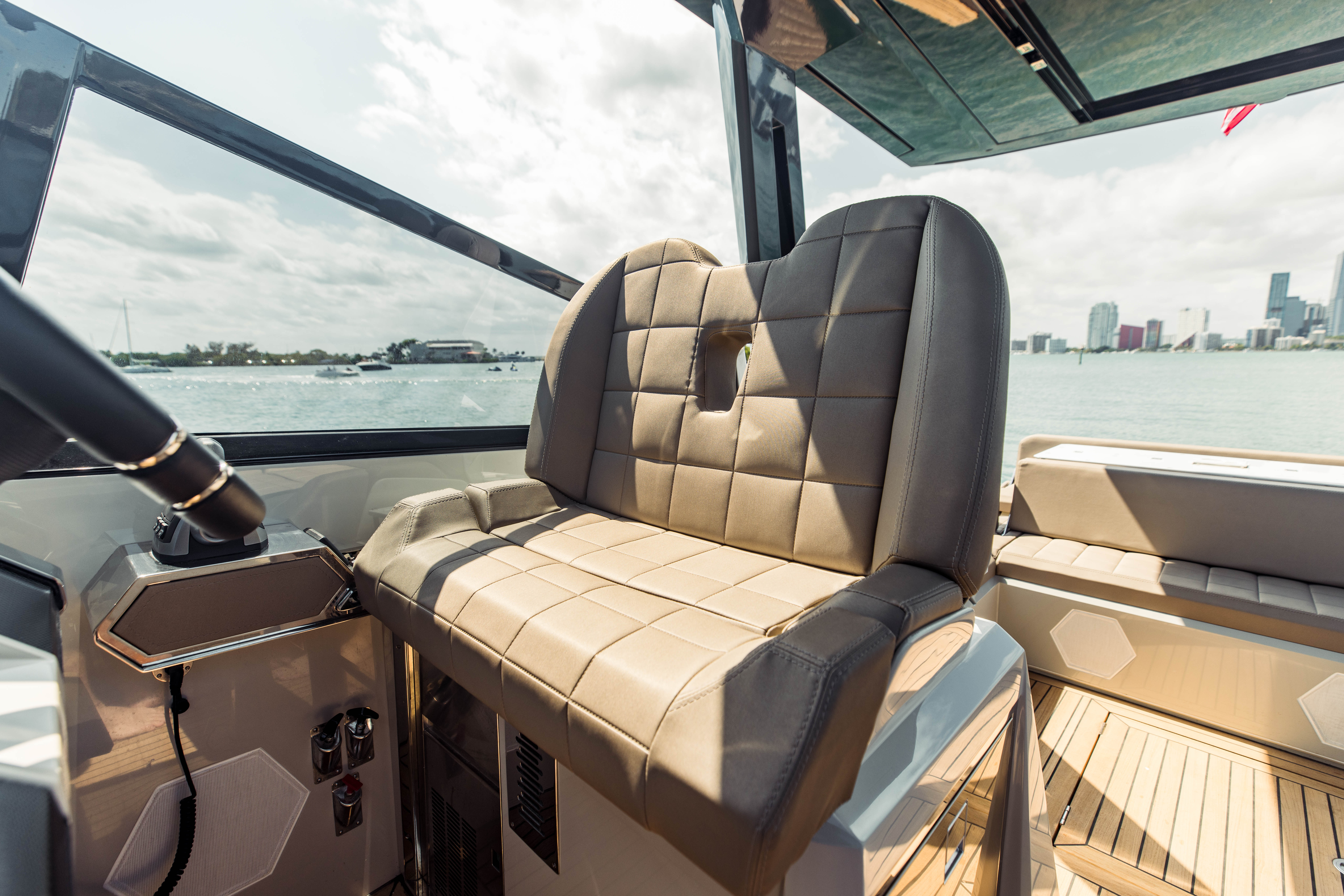 All the controls and navigation systems are integrated in the smooth lines of the console, where the steering wheel, the Volvo Penta IPS joystick and two 12’’ touchscreens allow for an exciting steering experience.