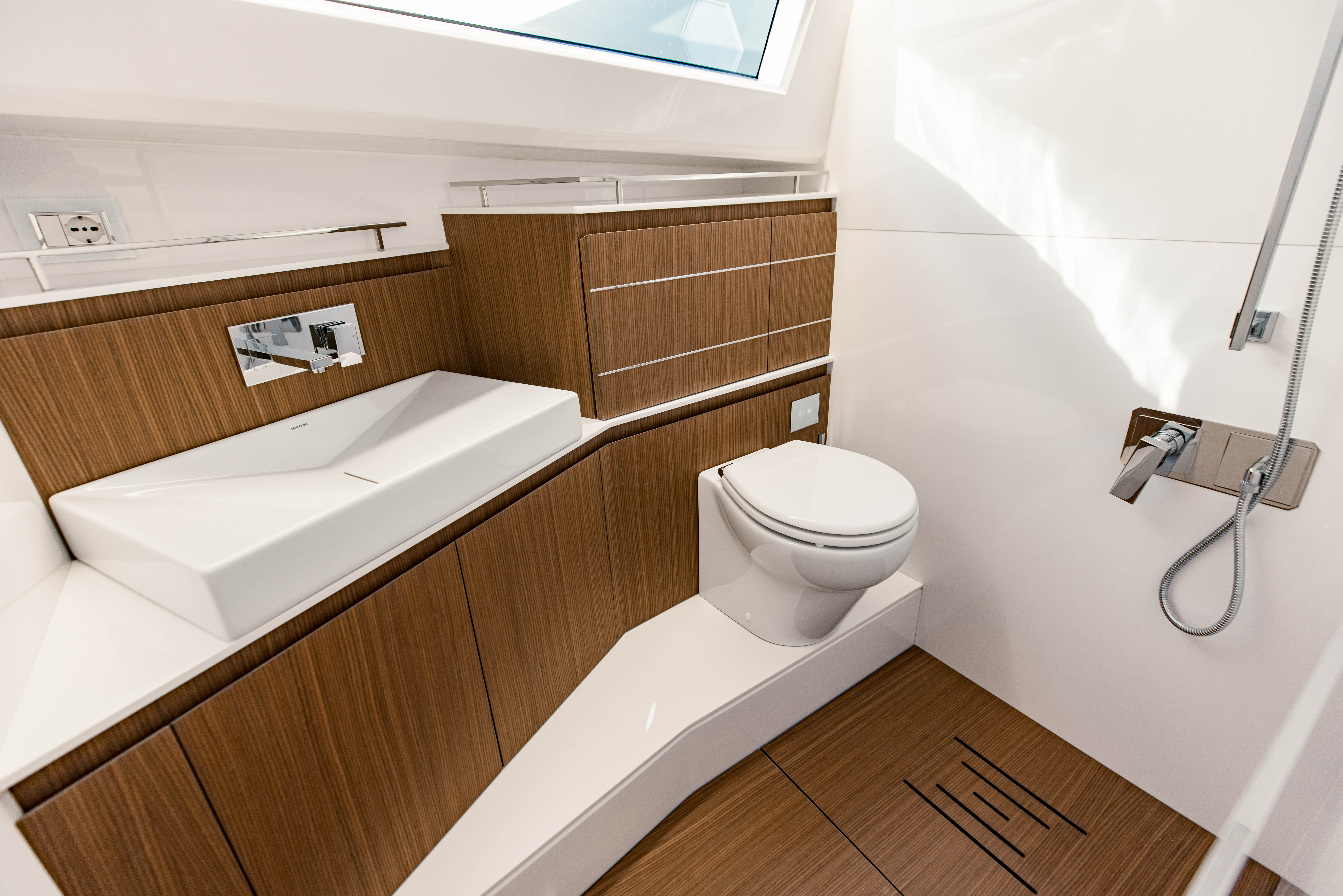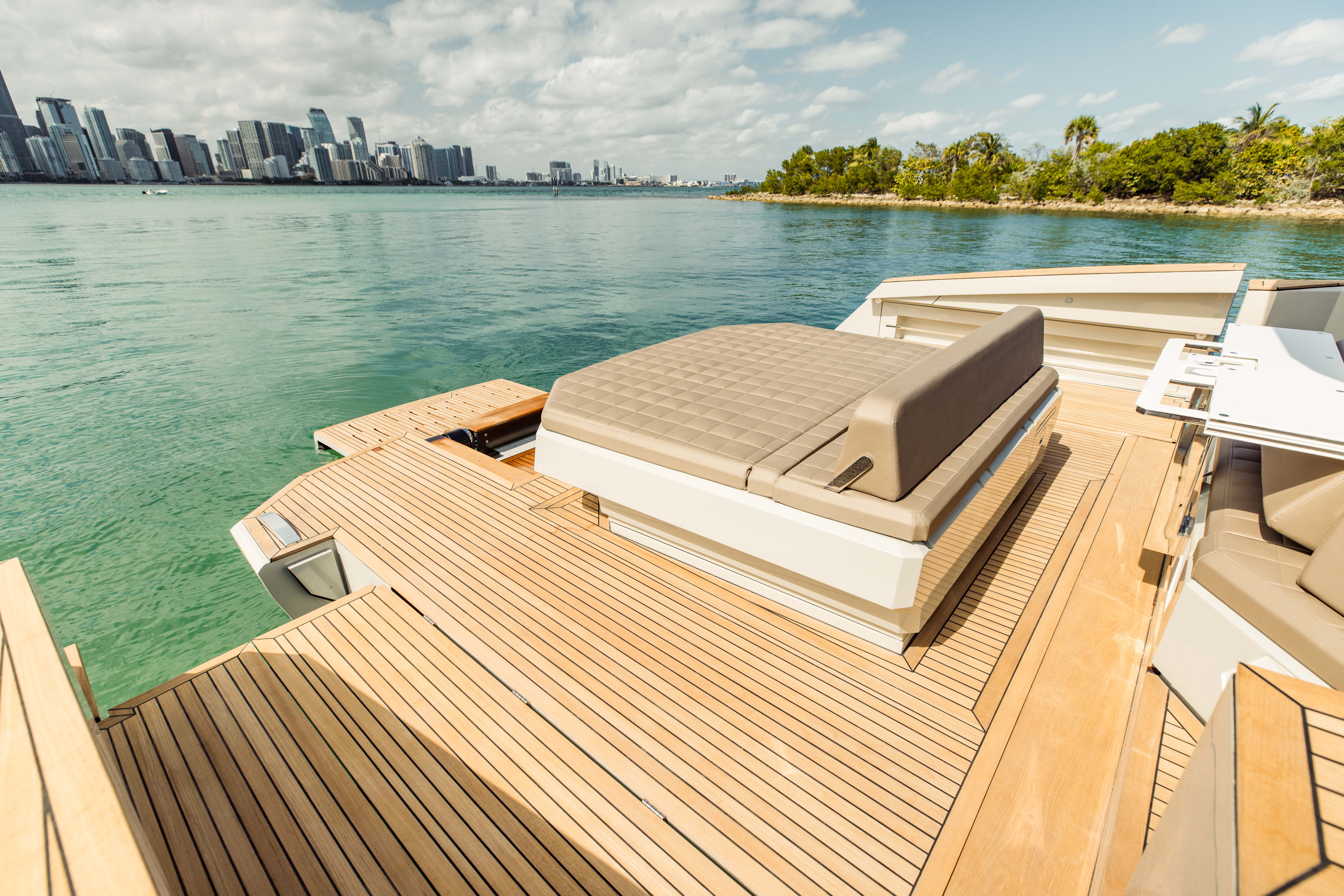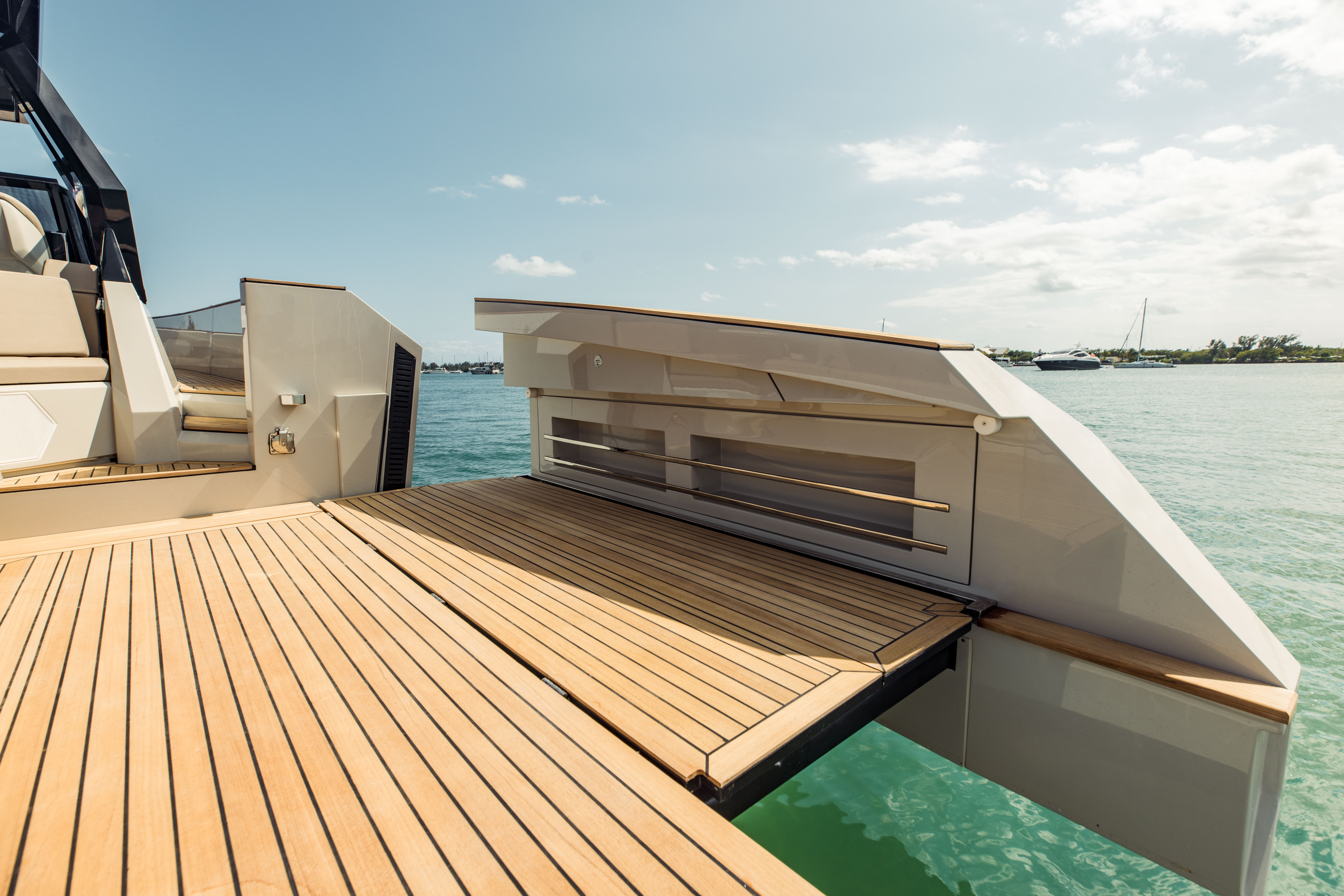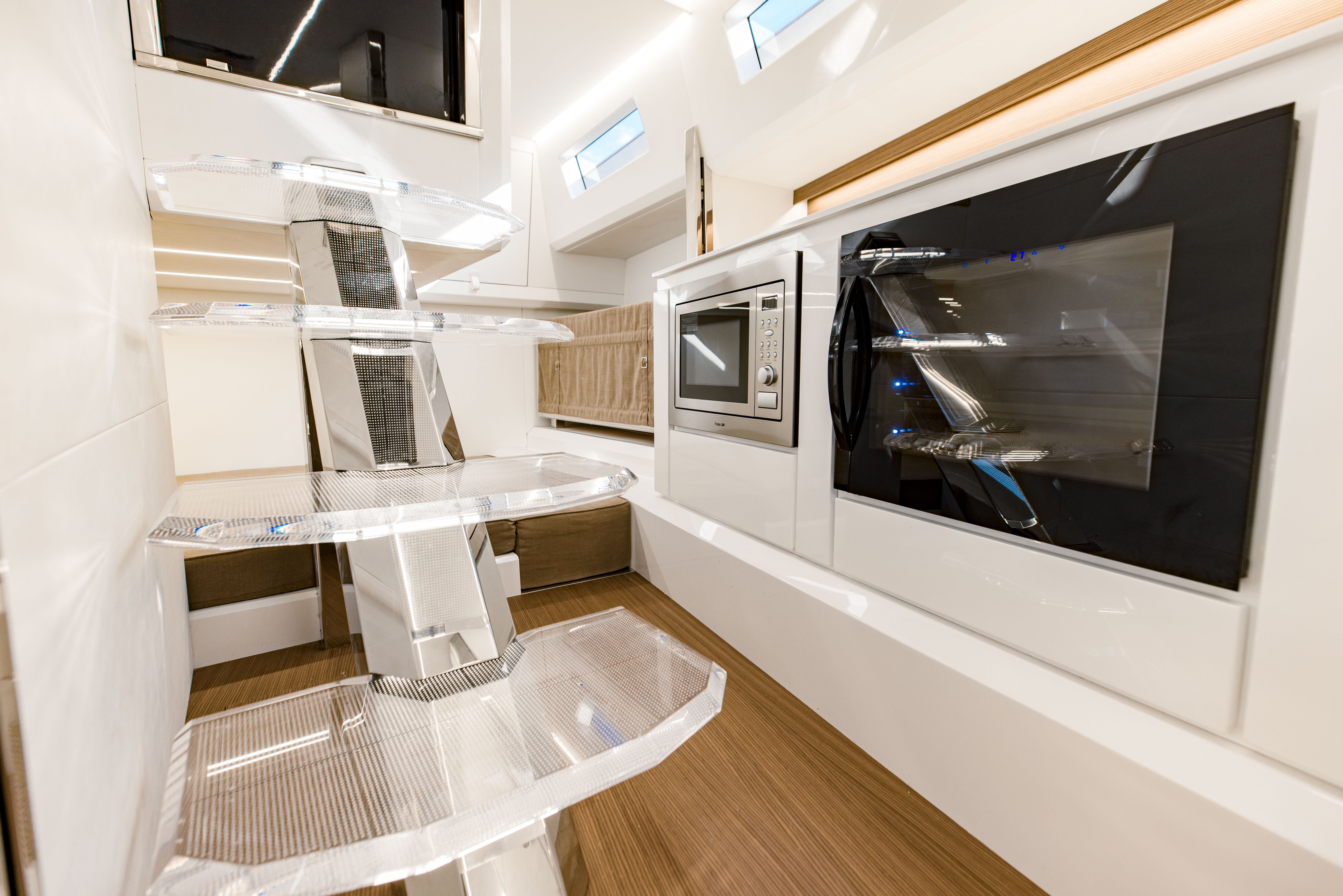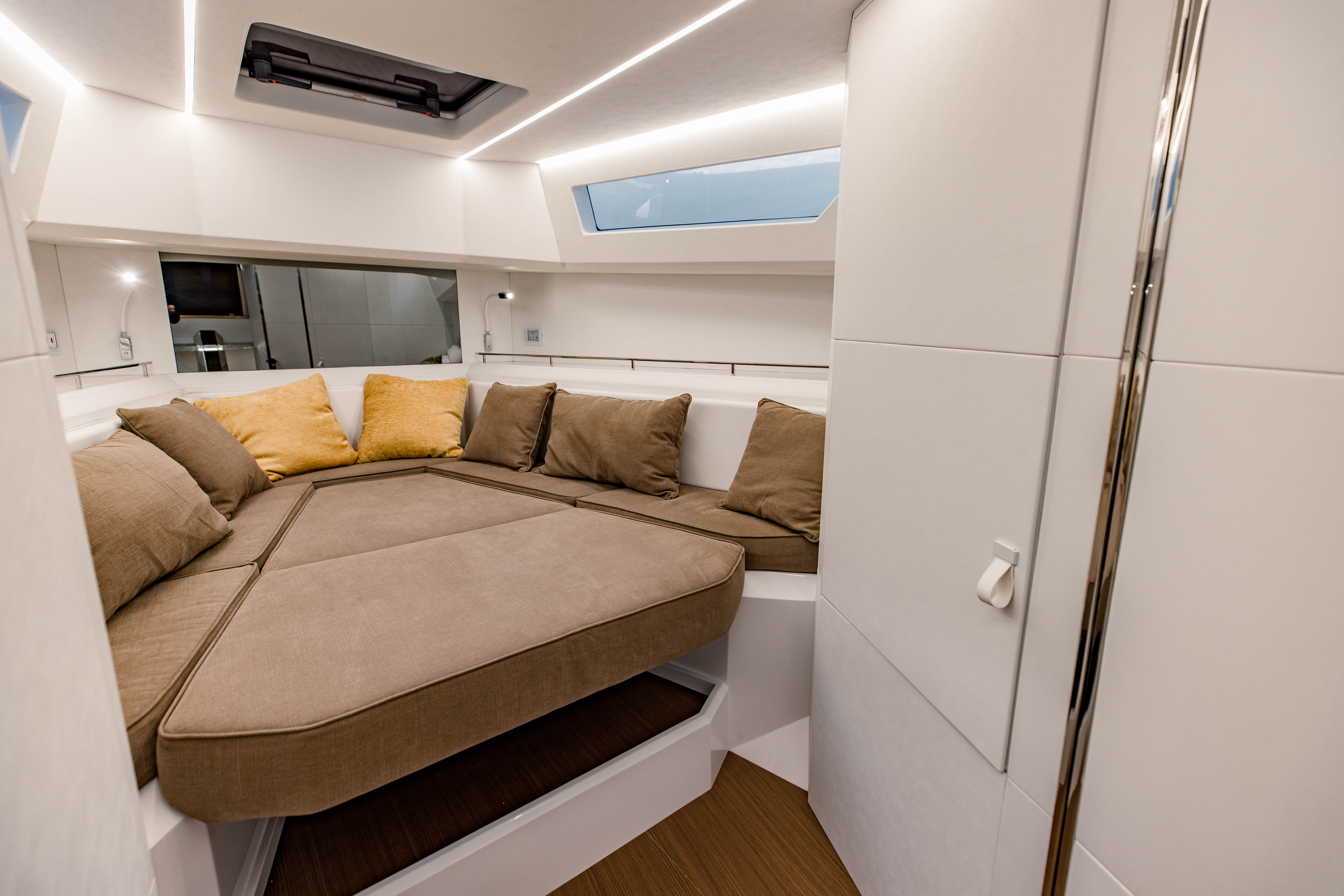 The multi-faceted bow has a spacious sundeck with cushions for two, high-end speakers integrated in the windscreen, the walkaround surface and a hydraulic hatch with hidden anchor, fenders and even a hand shower.