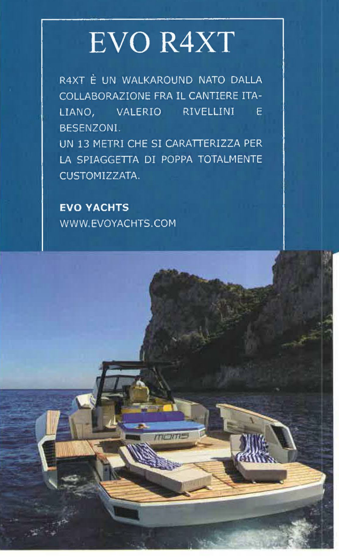 R4xt is a walkaround born from the collaboration between the Italian shipyard, Valerio Rivellini and Besenzoni. A 13-meter that is characterized by a totally customized stern platform.