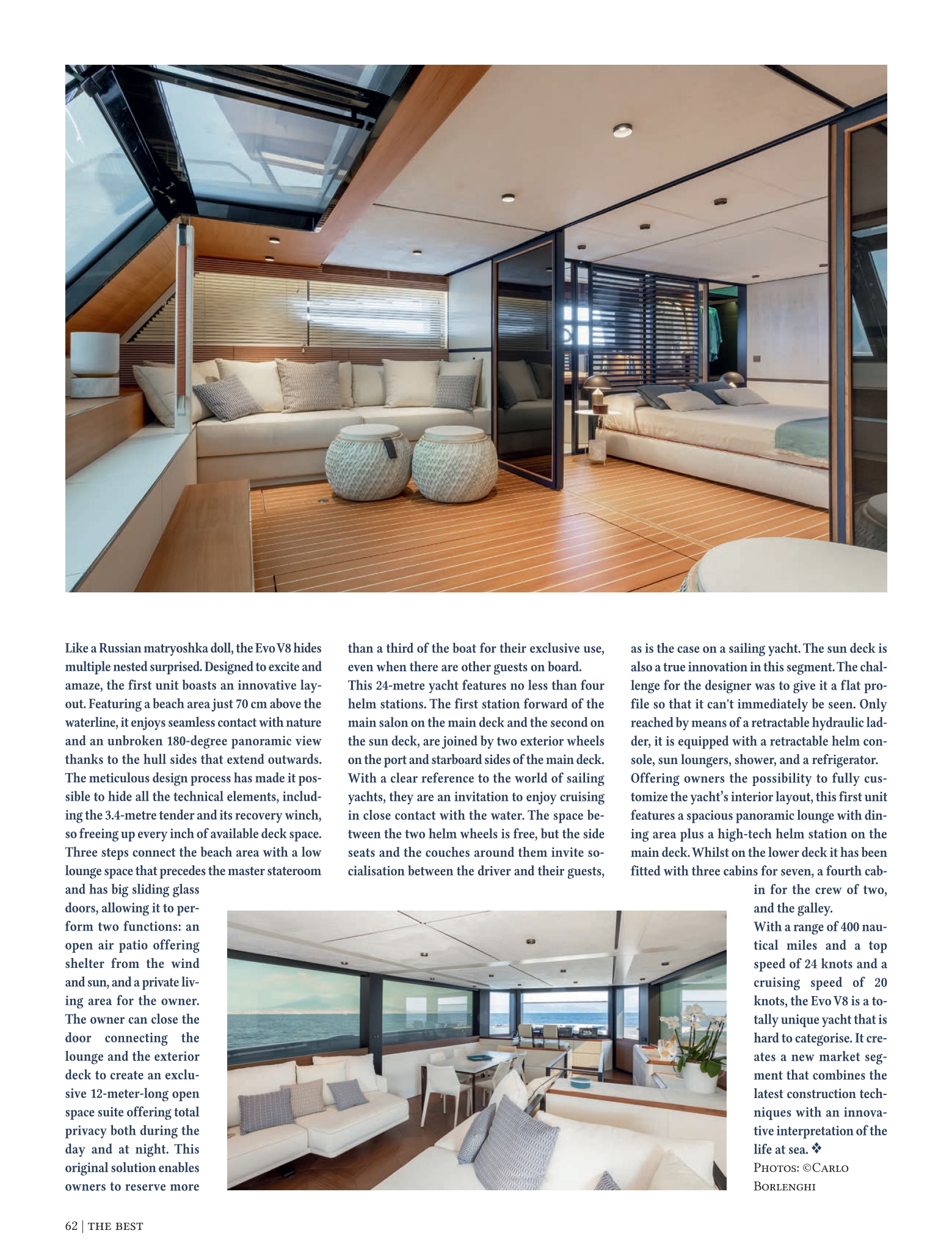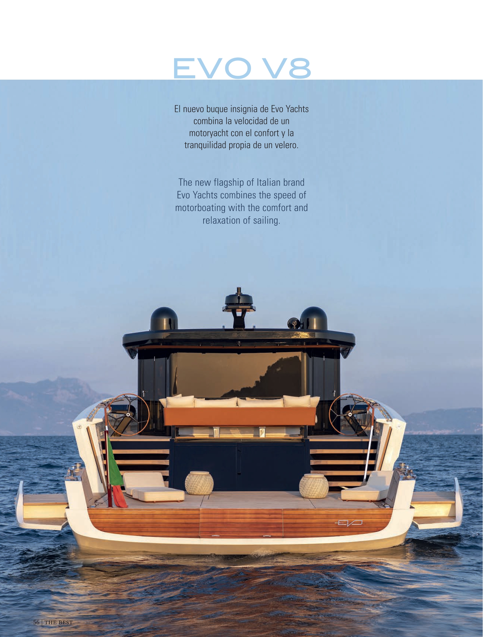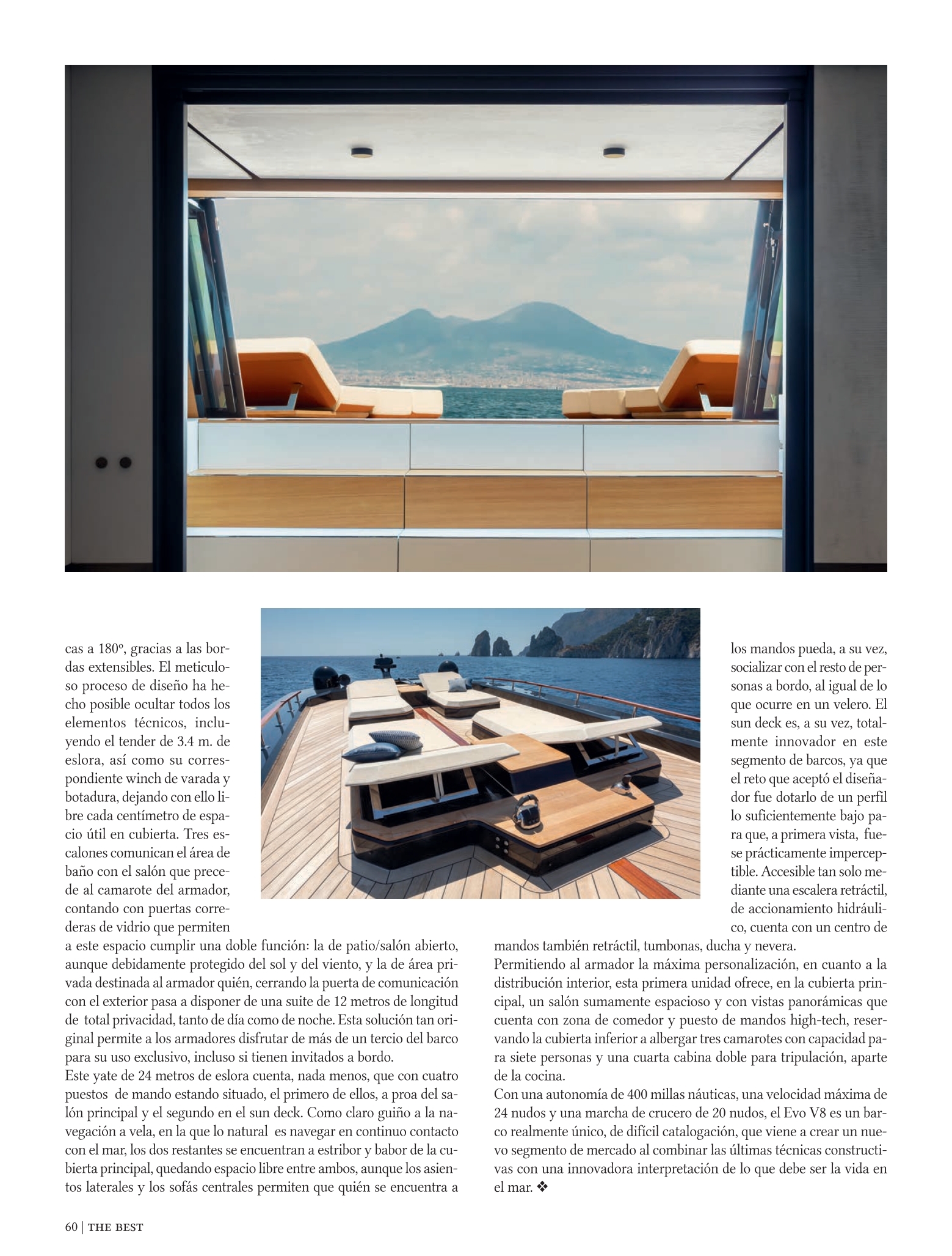 L’Evo V8 nasconde grandi sorprese. Progettata per emozionare e sorprendere, la prima unità offre una distribuzione innovativa, con la zona balneare a soli 70 cm sopra la linea di galleggiamento, che facilita un impareggiabile collegamento con la natura e consente di godere di viste panoramiche senza ostacoli a 180º, grazie ai binari estensibili.