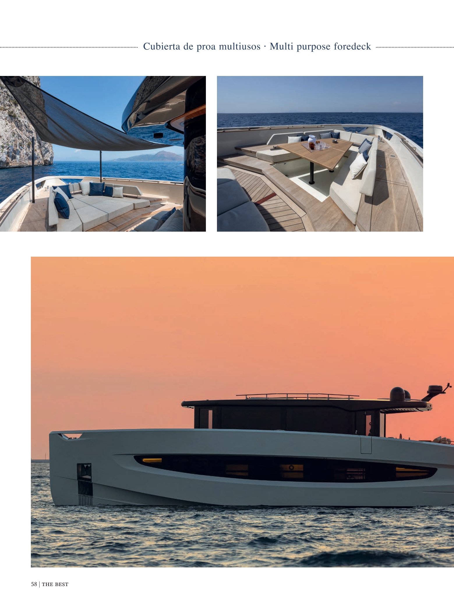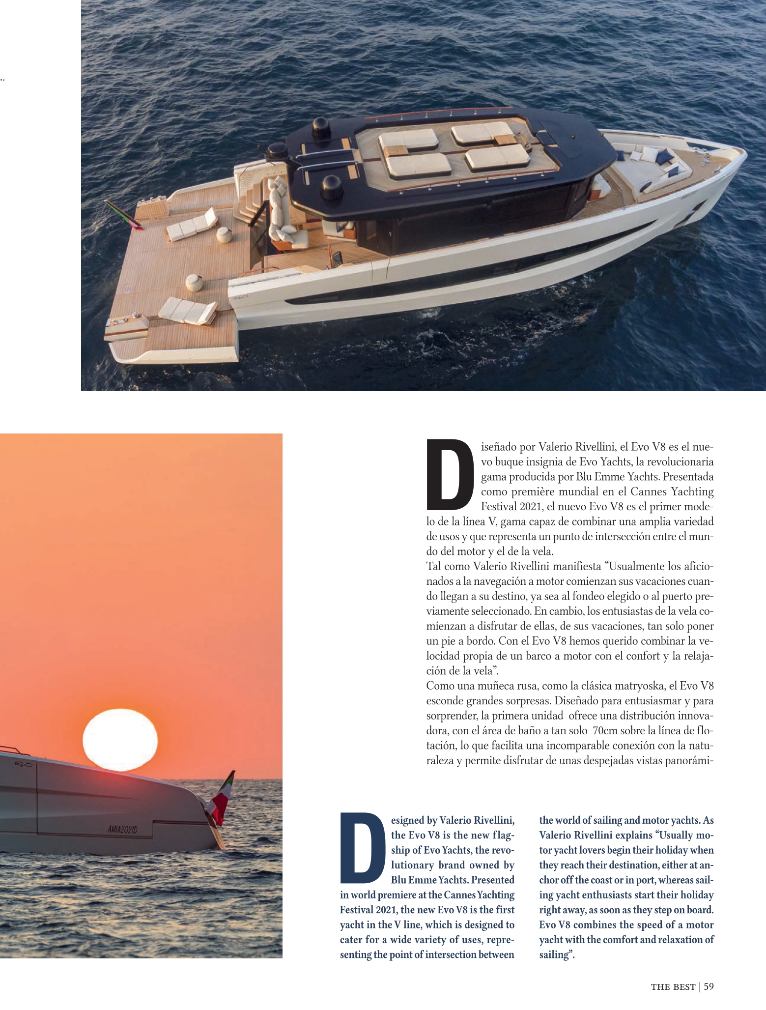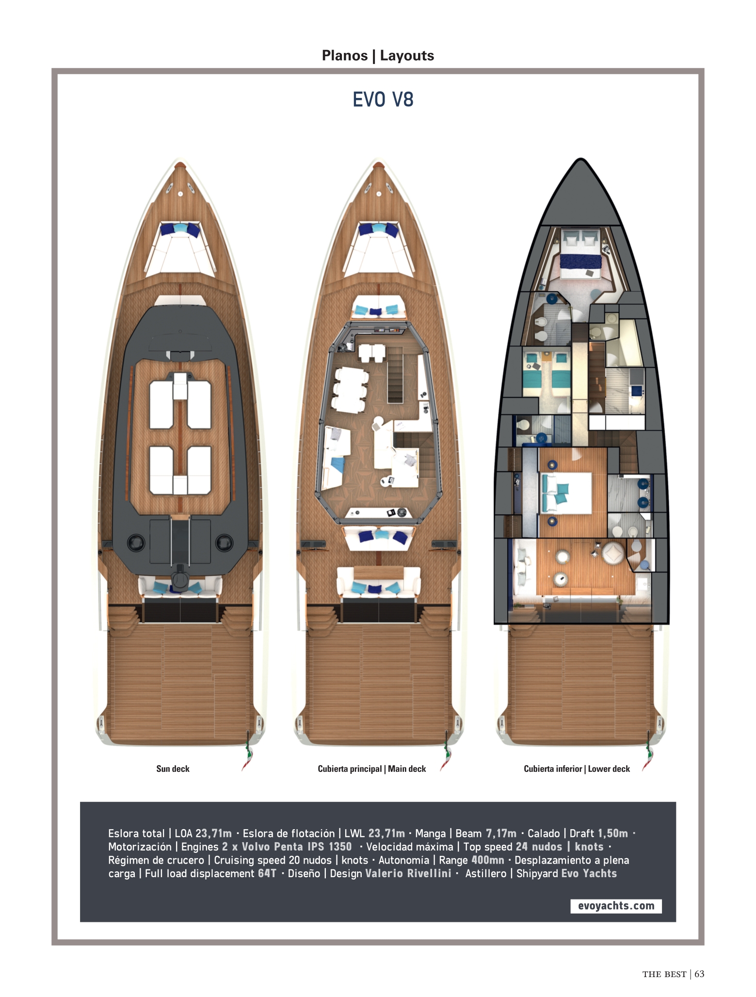 L’Evo V8 nasconde grandi sorprese. Progettata per emozionare e sorprendere, la prima unità offre una distribuzione innovativa, con la zona balneare a soli 70 cm sopra la linea di galleggiamento, che facilita un impareggiabile collegamento con la natura e consente di godere di viste panoramiche senza ostacoli a 180º, grazie ai binari estensibili.