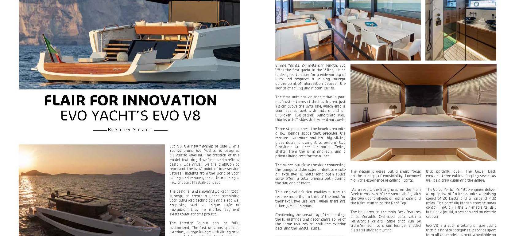 Evo V8 is the new flagship of Evo Yachts, the revolutionary brand owned by Blu Emme Yachts. 24 meters in length, Evo V8 is the first yacht in the V line, which is designed to cater for a wide variety of uses and proposes a cruising concept at the point of intersection between the worlds of sailing and motor yachts.
