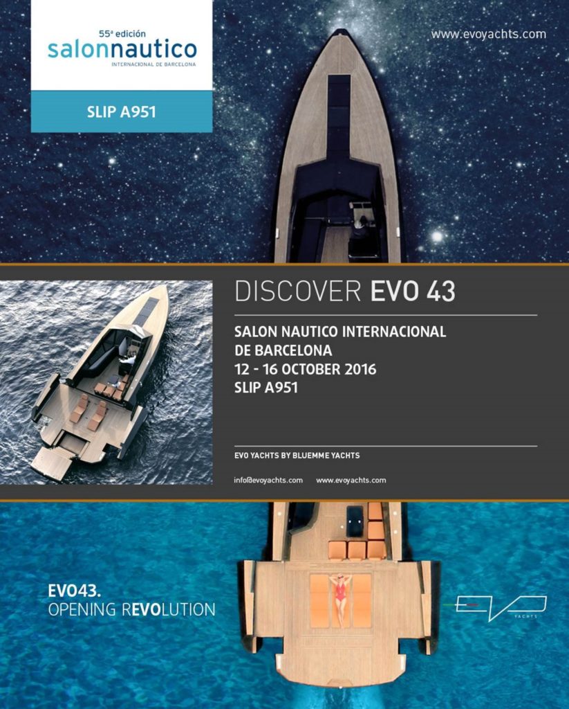 October 2016. Evo 43 keeps moving forward: after the appointments in Italy and the French Riviera, the boat will be back again on display at the Barcelona International Boat Show, scheduled from October 12th to October 16th 2016.
