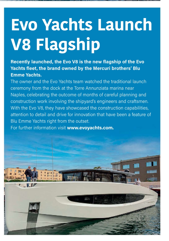 L’armatore e il team di Evo Yachts hanno assistito alla tradizionale cerimonia di varo dalla banchina del porto turistico di Torre Annunziata, vicino a Napoli, celebrando il risultato di mesi di attenta progettazione e costruzione che hanno coinvolto gli ingegneri e gli artigiani del cantiere.