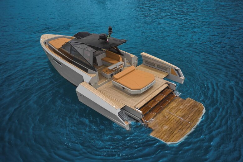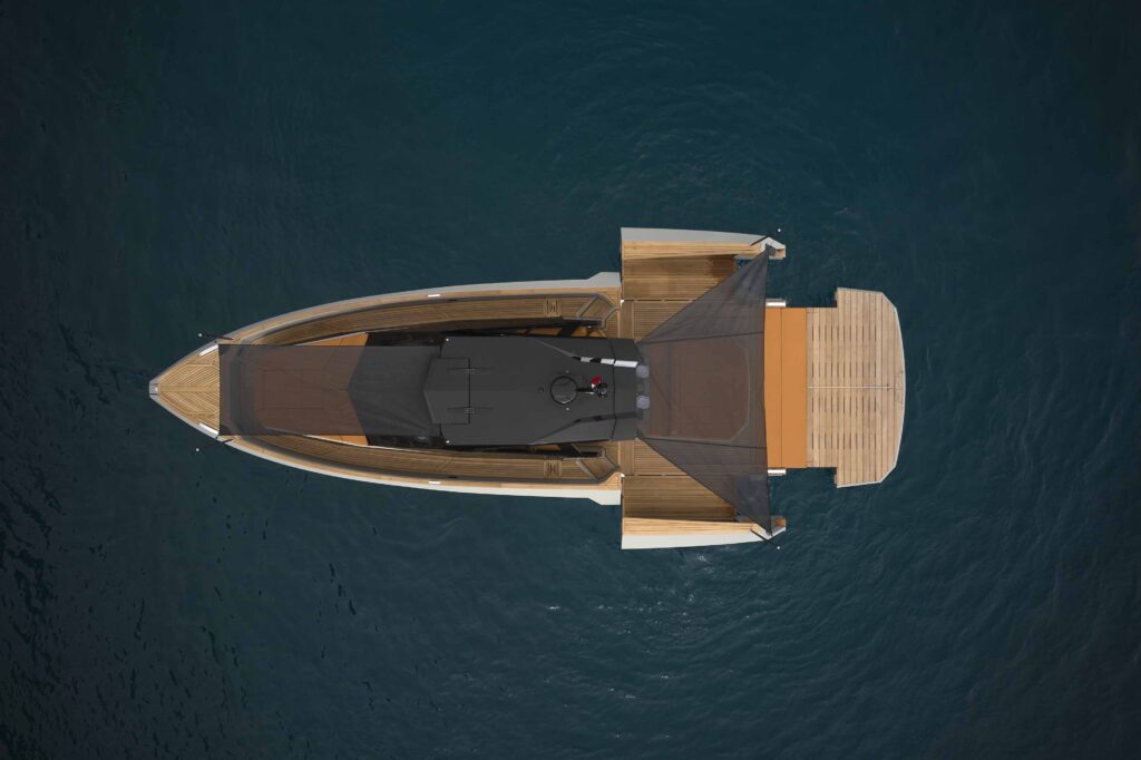 Il Cantiere e Valerio Rivellini – che ha firmato il design di esterni e interni – hanno dunque collaborato per lanciare sul mercato un modello caratterizzato in primis dal connubio tra la grande vivibilità degli spazi esterni unita alla comodità di un cabinato. Il risultato è una barca di 13 metri dall’aspetto grintoso che al tempo stesso offre un livello di comfort elevato e permette agli armatori di navigare in tutta comodità in diverse condizioni meteo, configurando in modo diverso alcune aree a seconda delle proprie esigenze grazie alle innovative soluzioni modulari dell’hard top e della zona di poppa.