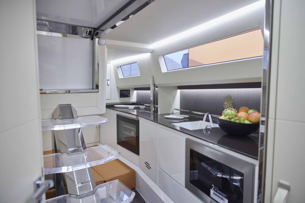 Gli interni del sottocoperta, pregiati, funzionali e sempre personalizzabili, prevedono ambienti confortevoli, caratterizzati ancora una volta dalla trasformabilità. Una porta si apre sulla scala di design in plexiglass, illuminabile e dagli ampi gradini antiscivolo, e conduce a una cabina matrimoniale. Seguono un bagno e, verso prua, un’ampia dinette con un grande mobile cucina che può accogliere diversi elettrodomestici e un tavolo a scomparsa che permette di ricavare un altro letto matrimoniale mentre uno specchio integra una TV.