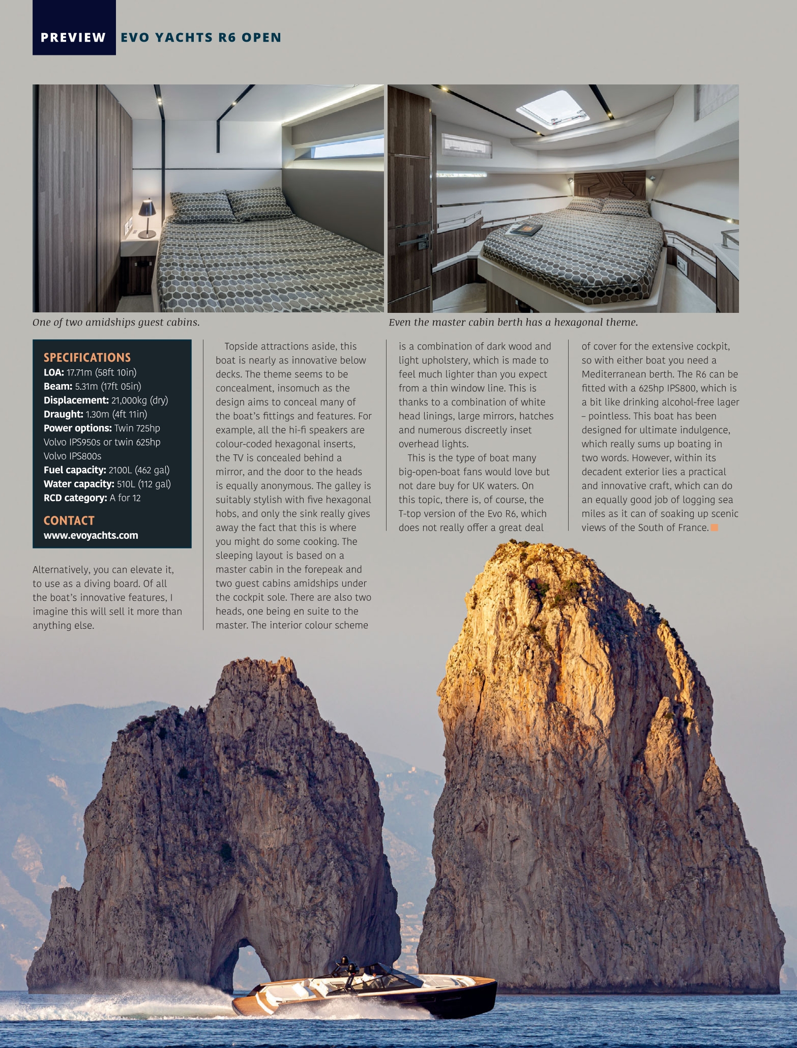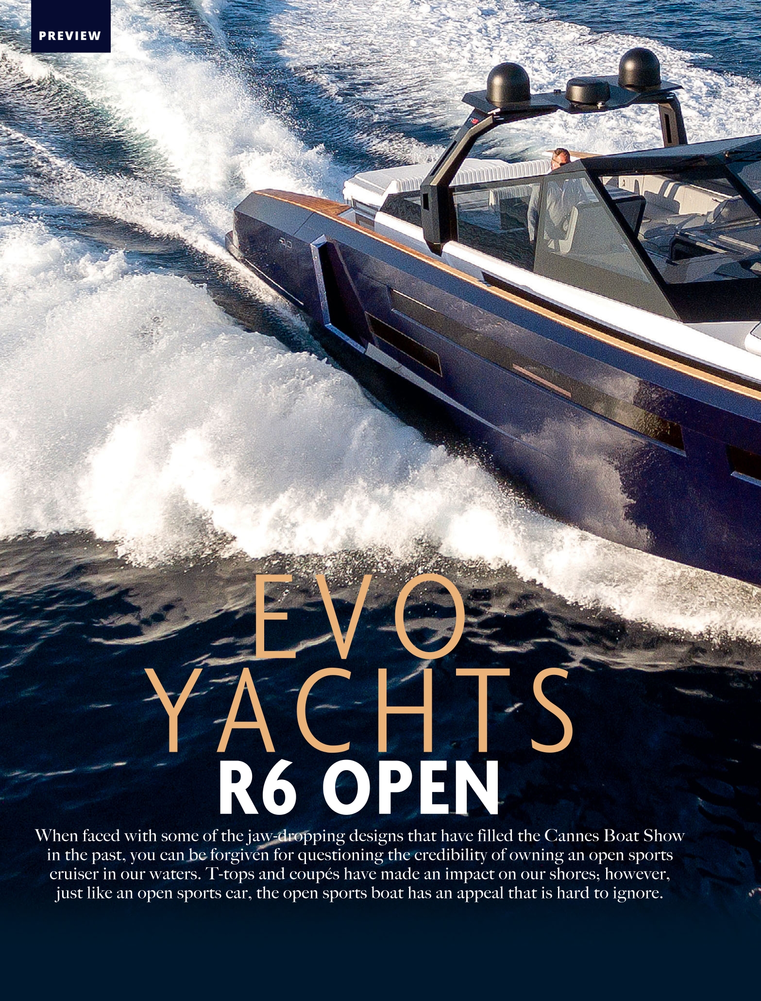 Il nuovo R6 Open di Evo Yachts è sicuramente una barca su cui sarai spinto a passare senza una seconda occhiata. Spudoratamente italiano, la sua straordinaria combinazione minimalista di stile retrò e moderno è resa ancora più sorprendente dall’assenza di una vera copertura nella parte superiore.