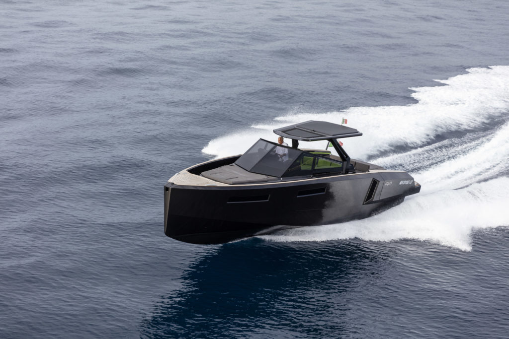 Evo R4 WA nella sua versione più accattivante e aggressiva: scafo color bronzo metallizzato e cuscineria bicolor (dark brown e lime green) esaltano il piglio sportivo, così come il T-top con montanti in acciaio e copertra in Silvertex.