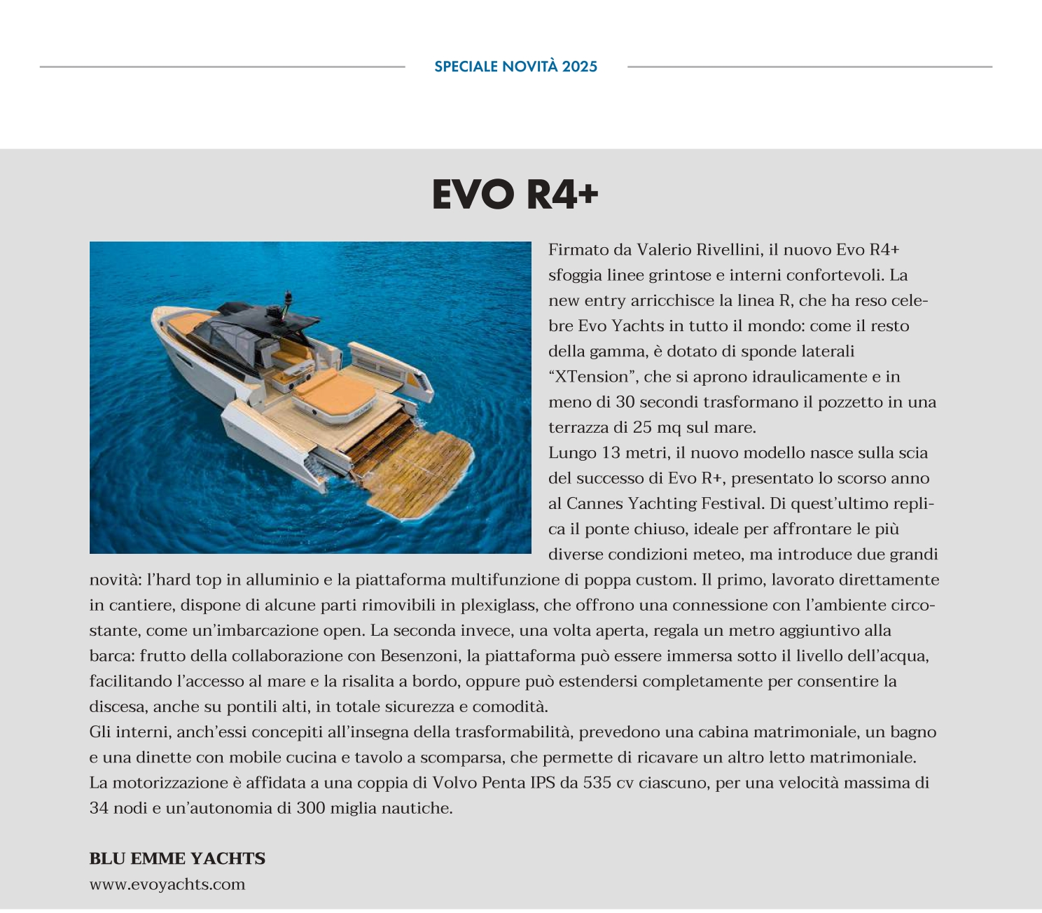 Firmato da Valerio Rivellini, il nuovo Evo R4+ sfoggia linee grintose e interni confortevoli. La new entry arricchisce la linea R, che ha reso celebre Evo Yachts in tutto il mondo: come il resto della gamma, è dotato di sponde laterali “XTension”, che si aprono idraulicamente e in meno di 30 secondi trasformano il pozzetto in una terrazza di 25 mq sul mare.
