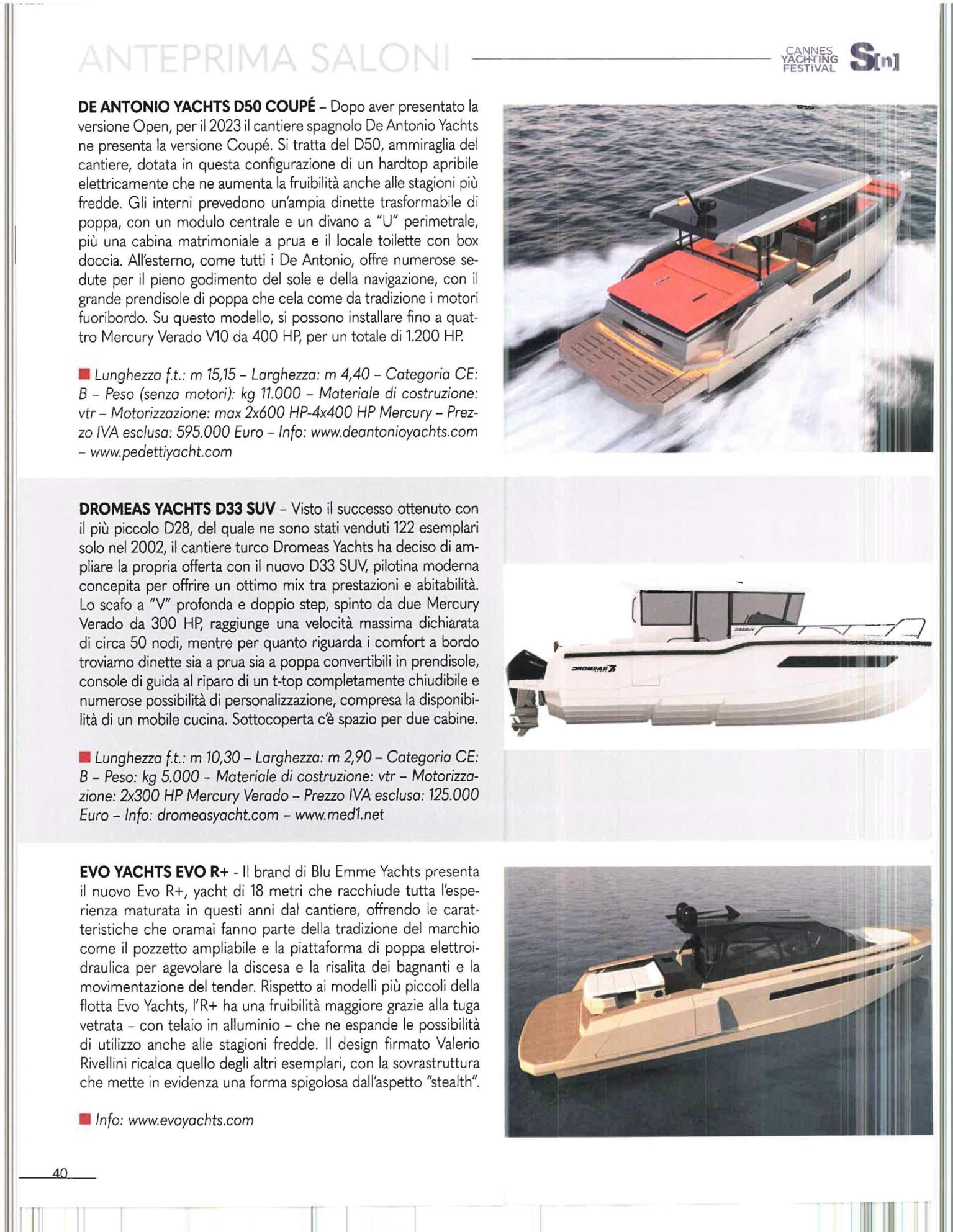 Il brand di Blu Emme Yachts presenta il nuovo Evo R+, yacht di 18 metri che racchiude tutta l’esperienza maturata in questi anni dal cantiere, offrendo le caratteristiche che oramai fanno parte della tradizione del marchio come il pozzetto ampliabile e la piattaforma di poppa elettroidraulica per agevolare la discesa e la risalita dei bagnanti e la movimentazione del tender. Rispetto ai modelli più piccoli della flotta Evo Yachts, l’R+ ha una fruibilità maggiore grazie alla tuga vetrata – con telaio in alluminio – che ne espande le possibilità di utilizzo anche alle stagioni fredde. Il design firmato Valerio Rivellini ricalca quello degli altri esemplari, con la sovrastruttura che mette in evidenza una forma spigolosa dall’aspetto “stealth”