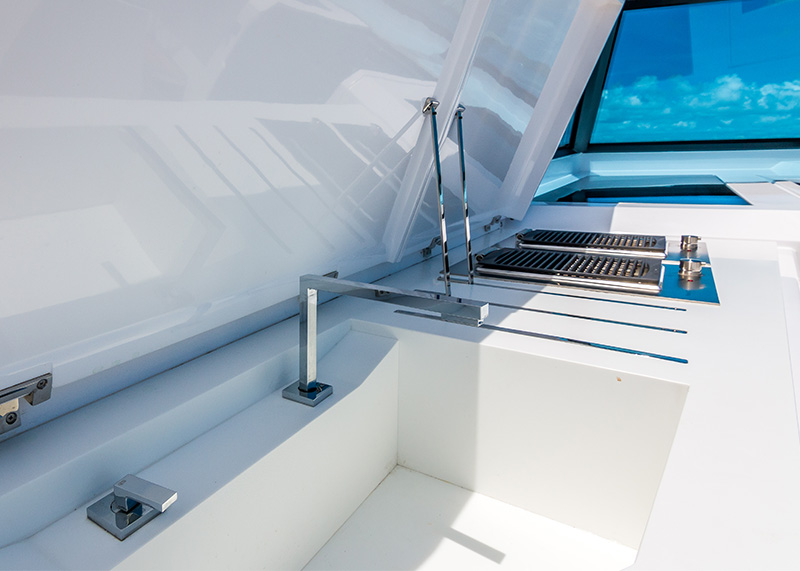 La prua è stata progettata per mantenere le linee completamente pulite, grazie all’ampio gavone che accoglie l’ancora e i parabordi.