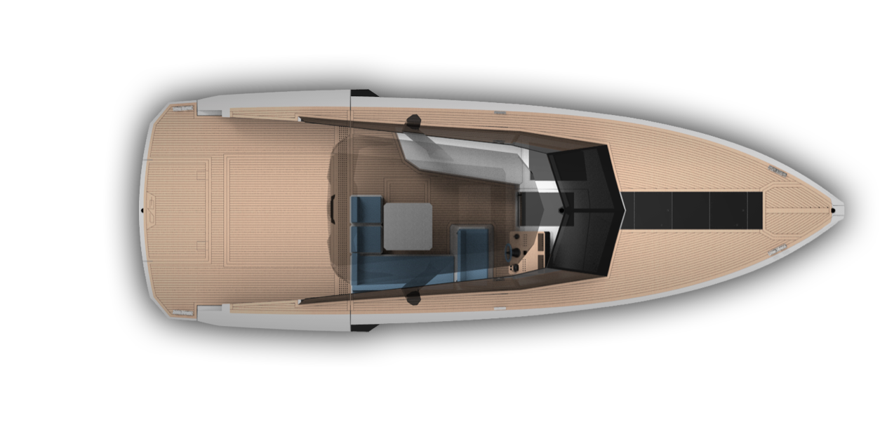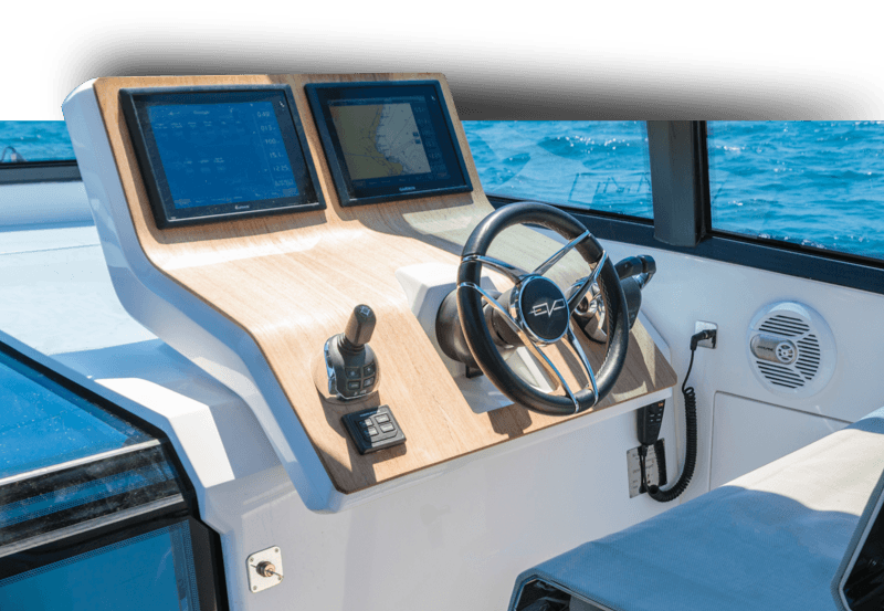 Il pannello in teak custodisce la plancia di comando, progettata per un’esperienza di guida veloce e responsiva, in una postazione confortevole con ampio parabrezza e una seduta accogliente.